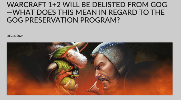 워크래프트I·II의 온라인 판매 중지와 함께 보존 프로그램 적용 사실을 알리는 GOG 공지. <GOG> 앞서 지난달 GOG는 퍼블리셔가 스토어에서 판매를 멈추거나 업데이트를 중단해도 게임을 계속 플레이할 수 있는 보존 프로그램을 도입한다고 발표했다.