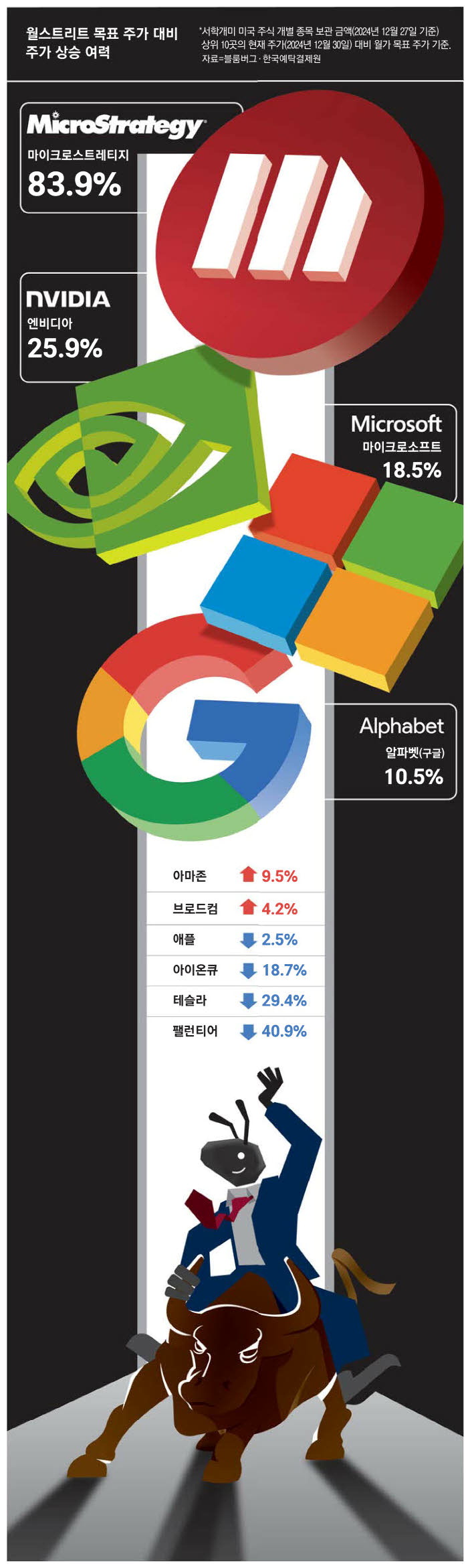 블룸버그와 한국예탁결제원에 따르면 서학개미 보관 금액(2024년 12월 27일) 기준 선호 주식 10곳 중 현재 주가(2024년 12월 30일) 대비 월가 목표 주가까지 상승 여력이 가장 큰 곳은 마이크로스트레티지(83.9%)다. 월가 투자은행 8곳은 이 주식의 향후 12개월 내 도달할 수 있는 평균 목표 주가로 557달러를 제시했다. 마이크로스트레티지의 지난달 30일 주가는 302.96달러다.