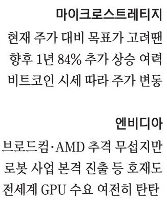 월가 투자은행들은 마이크로스트레티지·엔비디아·마이크로소프트(MS)·알파벳(구글)·아마존·브로드컴에 대해선 현재 주가 대비 목표 주가까지 상승 여력이 남아 있다고 본다. 반면 애플·아이온큐·테슬라·팰런티어에 대해선 현 주가가 이미 월가 목표 주가를 뛰어넘어 잠재 수익률이 떨어진다고 추정한다.