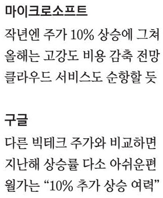 2025년 예상 EPS는 13.07달러로 전년 대비 10.7% 상승할 것으로 예상된다. EPS 상승의 또 다른 근거는 구조조정이다. 상대적으로 돈이 되지 않는 게임 사업부 몸집을 줄이고 있다. MS는 2024년 초에 게임 사업부에서 1900명을 정리해고한 데 이어 지난해 9월에도 650명을 추가로 감원했다. 월가는 2025년 MS 목표 주가로 503.51달러를 제시하고 있다. 현 주가 대비 18.5% 상승 여력이 남아 있는 셈이다. 구글 역시 구조조정과 클라우드 사업 성장에 따라 현 주가와 목표 주가 비교 시 잠재 수익률이 10.5%로 계산됐다. MS와 구글 모두 2024년에 다른 빅테크보다 덜 올랐다는 공통점을 갖고 있다.
