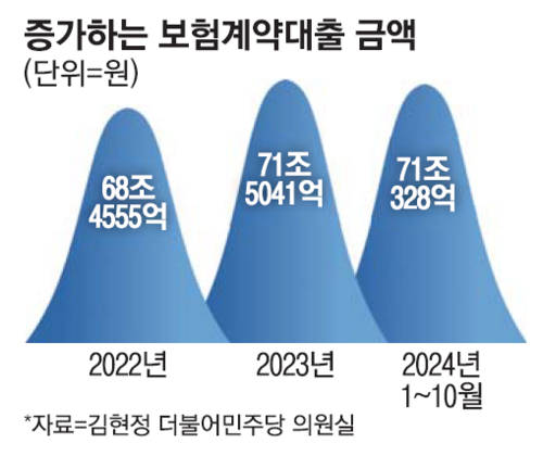 5일 국회 정무위원회 소속 김현정 더불어민주당 의원이 생명보험협회·손해보험협회에서 제출받은 자료에 따르면 국내 보험사들의 지난해 10월 기준 보험계약대출 잔액은 71조328억원으로 집계됐다.