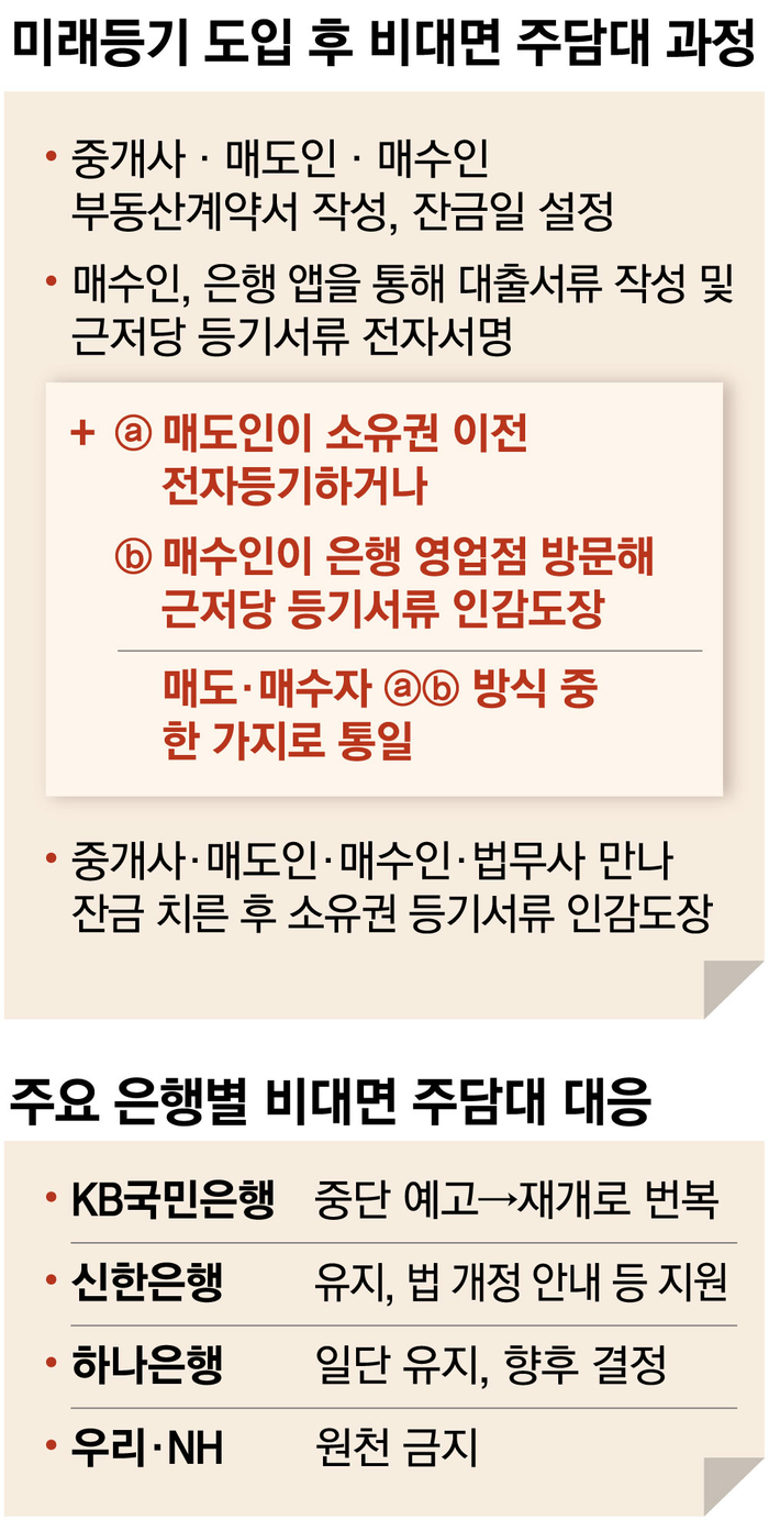 우리은행은 미래등기시스템 도입을 앞두고 아예 비대면 주담대 판매를 막았다. NH농협은행도 이달 31일부터 비대면 대출 상품 운영을 중단한다. 우리은행 측은 “담보대출의 핵심인 소유권 이전 등기와 근저당권 설정 등기에서 변화가 있었고,이에 따라 혹시 발생할지 모르는 고객 혼란과 피해 방지를 위해 당분간 대면으로만 주담대를 취급하기로 했다”고 설명했다.