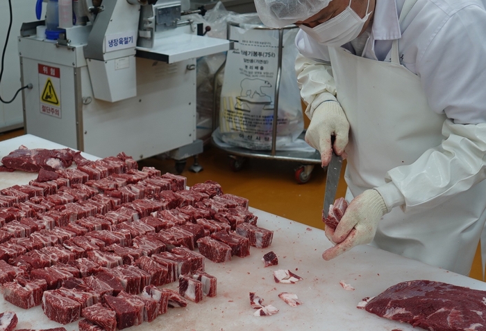 충남 아산에 위치한 영인산한우 육가공센터에서 작업자가 설을 앞두고 찜용 갈비를 손질하고 있다. 설을 앞두고 찾은 충남 아산의 한 한우가공센터. 설 선물용 찜용 갈비 손질이 한창이다. 먹기 좋은 크기로 잘라진 갈비를 작업대 위에 가지런히 쌓아놓고 손으로 하나씩 집어 고깃덩어리 곳곳에 붙어 있는 지방을 칼로 정교하게 발라내고 있다.