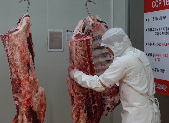 충남 아산에 있는 영인산한우 육가공센터에서 작업자가 암소 한우 발골 작업을 하고 있다. 영인산한우는 공판장에서 한우를 낙찰받아 발골과 정형을 통해 원육을 가공할 뿐만 아니라 소매육으로도 직접 가공해 온라인과 자체 직영 매장에서 판매하는 등 일관 생산·판매 체제를 갖추고 있다. 이 때문에 다른 육가공 업체들에 비해 가격 경쟁력이 높다고 회사 측은 설명했다. 황오순 대표는 “좋은 등급을 받은 한우를 경매장에서 낙찰받은 뒤 HACCP 인증을 받은 가공센터에서 지방을 꼼꼼히 제거하는 등 최상의 품질로 가공하고,최신 포장 설비로 상품화해 고객에게 제공하고 있다”며 “가격과 품질 모두에서 고객들로부터 신뢰를 쌓아가고 있다”고 소개했다.