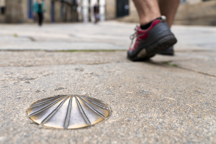 detail of the foot with the pilgrim‘s shoe walking along the santiago path - santiago’s shell