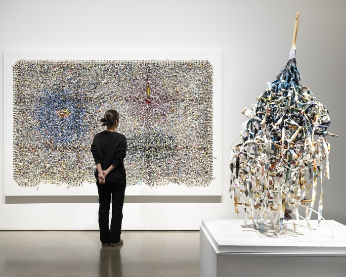 다만 192×291×10㎝ 크기의 전시작 ‘공간별곡’(2009)은 ‘누아주’ 시리즈 중 가장 큰 스케일의 작업으로,최소 서너 점의 평면 추상 회화가 해체됐다 다시 엮인 것으로 추정된다. 갤러리현대 관계자는 “이 정도 규모의 ‘공간별곡’ 작품은 단 3점 정도밖에 존재하지 않는다”고 설명했다. ‘공간별곡’은 멀리서 보면 평면의 회화처럼 보이지만 가까이 다가서면 숨겨진 두세 개의 층이 드러나면서 깊은 공간적 경험을 선사한다. 작가는 화면 곳곳에 다 쓴 붓을 배치해 이 작품이 회화에서 비롯된 것임을 암시했다.