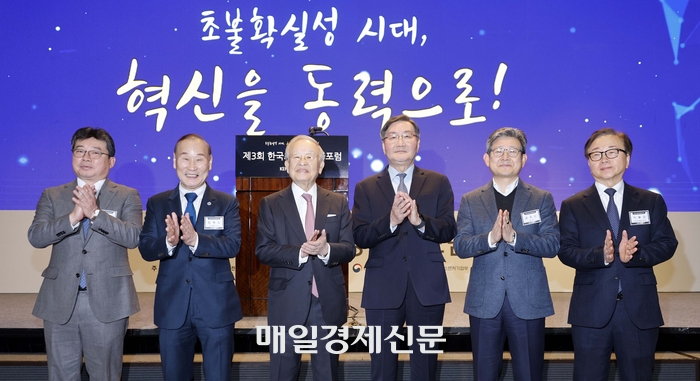 손경식 한국경영자총협회 회장을 비롯한 내빈들이 6일 오전 서울 중구 웨스틴 조선 서울 그랜드 볼룸에서 열린 ‘제3회 한국최고경영자포럼’ 에서 기념촬영을 하고 있다.