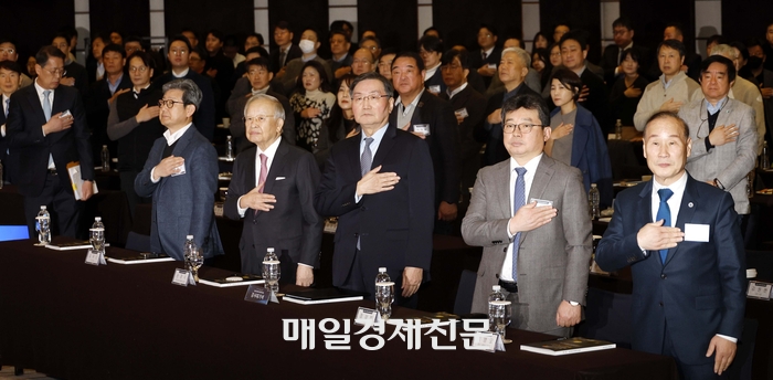 손경식 한국경영자총협회(경총) 회장(왼쪽 두번째)이 6일 서울 중구 웨스틴 조선 호텔에서 열린 한국최고경영자포럼에서 참석자들과 국기에 경례하고 있다. 2025.2.6 [김호영기자]