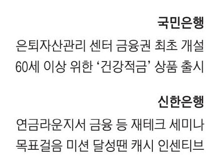 은행들은 상품 판매 외에도 시니어 전문 센터를 운영하면서 금융자산 전문 상담 서비스를 제공 중이다. 해당 서비스는 주로 자산가를 대상으로 하지만 일반 고객들을 대상으로 한 교육 등에 나서는 곳도 있다.