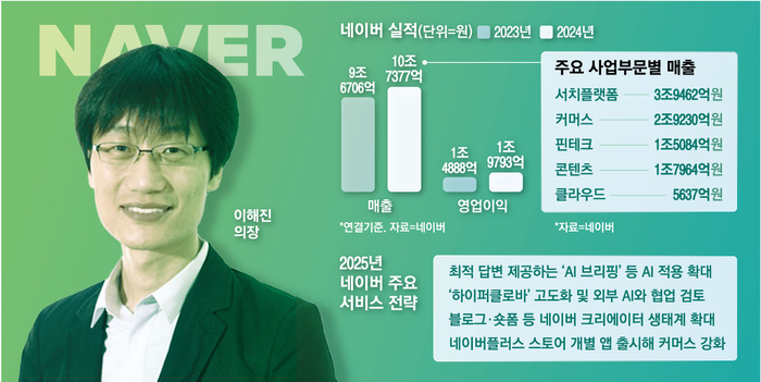 서치플랫폼 사업은 이용자들의 체류 시간 증가와 신규 광고 지면 확대에 힘입어 지난해 3조9462억원의 매출을 올리며 2023년 대비 9.9% 성장했다. 커머스 매출은 구독자 혜택을 강화한 네이버플러스 스토어 출시,넷플릭스와의 멤버십 제휴 등을 통해 경쟁력을 높인 덕에 같은 기간 14.8% 증가한 2조9230억원을 기록했다. 두 핵심 사업은 지난해 네이버 전체 매출에서 64%를 책임졌다.