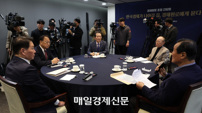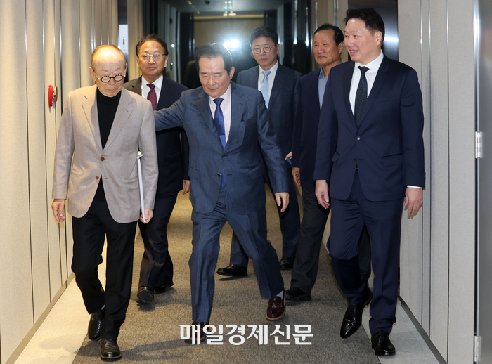 최태원 대한상의 회장(오른쪽)과,이헌재 前부총리 겸 재정경제부 장관(왼쪽),유일호 前 부총리 겸 기획재정부 장관(왼쪽 두번째),정세균 前 국회의장·국무총리(왼쪽 세번째),윤증현 前 기획재정부 장관(왼쪽 다섯번째)이 12일 서울 중구 대한상의에서 열린 ‘대한상공회의소,경제원로 초청 간담회’에 입장하고 있다. 25.02.12 /현장풀 이충우기자