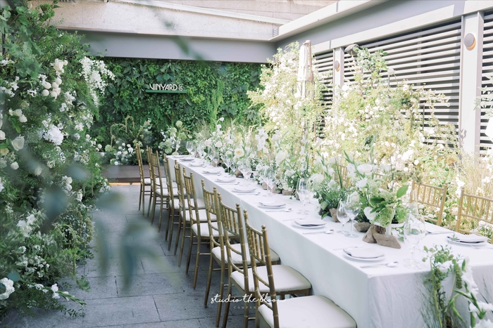 가든 웨딩 콘셉트로 꾸민 빈야드15 야외 루프탑 / 사진=코트야드 서울 보타닉 파크 신랑신부를 위한 웨딩 혜택도 알차다. 가든 키친 뷔페 시식과 파크뷰 객실 1박,하객 객실 할인,결혼 1주년 기념 식사권,리무진 서비스까지 포함했다. 나중에 돌잔치를 열 때도 대관료 깎아준다.