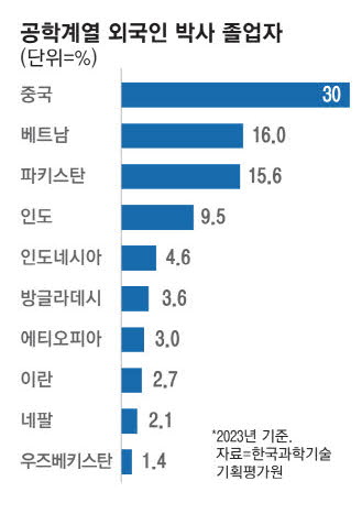 중국 국적을 가진 공학 분야 국내 배출 외국인 박사 수가 크게 늘고 있다는 조사 결과가 나왔다.