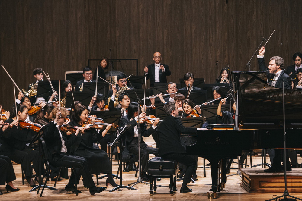 지난해 3월 통영국제음악당에서 열린 통영국제음악제에서 협연 무대를 선보이는 통영페스티벌오케스트라와 피아니스트 베르트랑 샤마유. 통영국제음악제 사무국