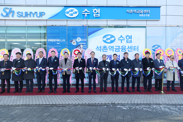 노동진 수협중앙회장이(사진 가운데) 지난달 14일에 열린 하동군 석촌역금융센터 개점식에 참여해 기념사진을 촬영하고 있다. [사진 출처 = 수협중앙회] 노동진 수협중앙회장의 대표 공약이었던 ‘복합점포’가 일선 수협의 성장을 견인하는 창구로 자리매김하고 있다.