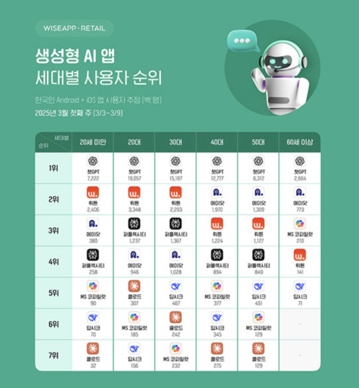 [사진 = 와이즈앱·리테일] 오픈AI의 챗GPT가 국내 생성형 인공지능(AI) 앱 사용 순위에서 굳건하게 전 연령대 1위를 지키고 있다.