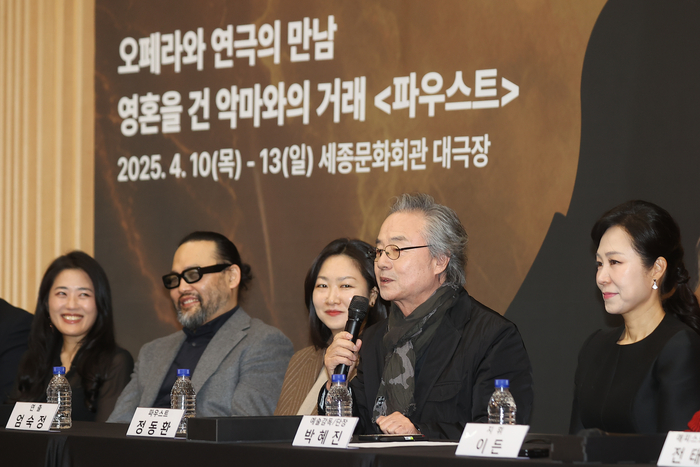 20일 서울 세종문화회관에서 열린 서울시오페라단 ‘파우스트’ 제작 간담회에서 나온 소프라노 손지혜,베이스바리톤 사무엘 윤,연출가 엄숙정,배우 정동환,예술감독 박혜진 서울시오페라단장(왼쪽부터). 연합뉴스 오페라에 연극을 입힌 새로운 ‘파우스트’가 온다. 서울시오페라단이 창단 40주년을 맞아 4월 10~13일 서울 세종문화회관 대극장에 올리는 프로덕션이다. 무엇보다 1막에 연극 형식을 입혀 ‘오플레이’(Opera+Play)라는 이종 결합을 시도한다. 배우 정동환이 노년의 파우스트로 1막에 등장해 독백 등 연기를 선보이고 2~5막에선 성악가들이 오페라 형식을 펼친다.