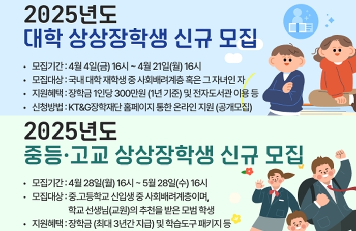 [사진=KT&G장학재단] KT&G장학재단은 사회배려계층 청소년의 안정적인 학습 활동과 진로탐색 환경 조성을 위해 ‘2025년도 상상장학생’을 모집한다고 7일 밝혔다.