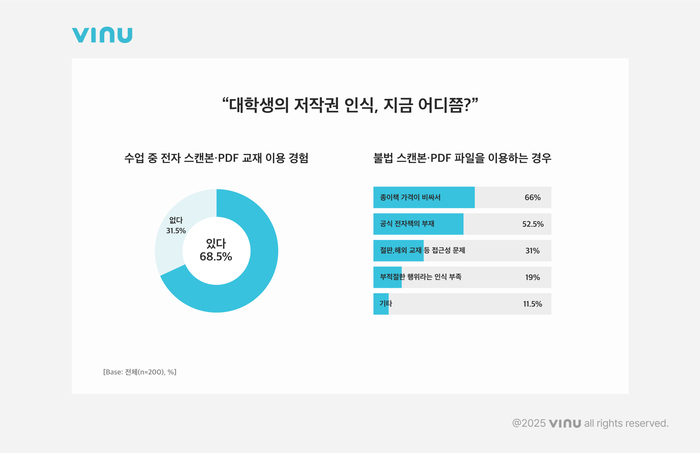 이어 ▲‘공식 전자책의 부재’(52.5%),▲’절판·해외 교재 등 접근성 문제’(31%),‘부적절한 행위라는 인식 부족’(19%) 순으로 나타났다.