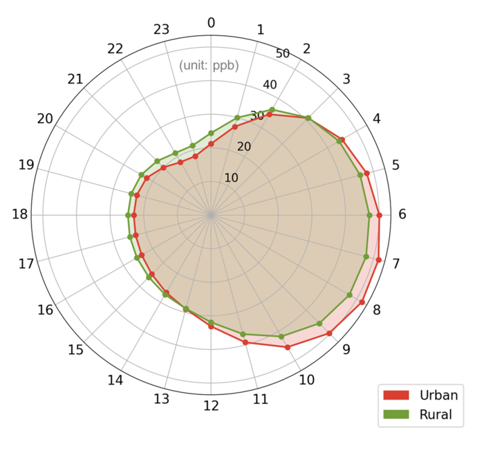 도심과 농촌 지역의 시간대별 오존 농도 및 기준 초과 분포 비교. 주간에는 도심 지역의 오존 농도가 높지만,해가 진 후에는 농촌 지역의 오존 농도가 더 높다. [사진=UNIST] 기침과 메스꺼움,천식을 유발하는 오존은 자동차 등이 내뿜는 오염물질이 햇빛과 만나 만들어진다. 통상 자동차나 공장이 많은 도심이 위험지역으로 꼽혔지만,농촌도 안전하지 않다는 연구 결과가 나왔다. 오존은 초미세먼지보다 작아 보건용 마스크로도 막을 수 없으며,폐포 깊숙이 침투해 염증 반응을 유발할 수 있다.