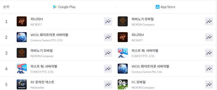 구글 플레이 스토어에서는 ‘리니지M(1위)’,‘마비노기 모바일(3위)’,‘RF 온라인 넥스트(5위)’가 모두 MMORPG 장르다. 애플 앱스토어에서는 ‘마비노기 모바일(1위)’,‘리니지M(2위)’가 ‘라스트 워: 서바이벌’(3위),‘WOS: 화이트아웃 서바이벌’(4위) 등 중국 게임을 제치고 1~2위를 차지했다.
