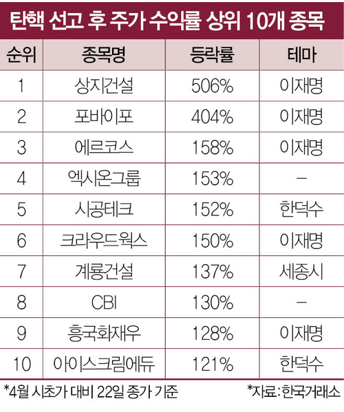 어김없이 ‘큰 장’ 선 정치테마주이재명 테마주 상지건설 6배↑증권가에서 대선 테마는 선거철마다 빠짐없이 등장한다. 이번에도 큰 장이 열렸다. 6·3 조기 대선을 앞두고 주요 대선 주자들과 별의별 인연으로 엮인 정치테마주가 요동친다. 이번 조기 대선은 이재명 민주당 경선 후보 강세가 뚜렷해 이 전 대표 관련 테마주가 수익률 상위권을 휩쓸었다.금융투자 업계와 한국거래소에 따르면,주식 시장에서 대선 주자들과 얼토당토않은 인연으로 엮인 테마주가 판을 치고 있다. 금융투자 업계에서는 전체 2000여개 상장 주식 가운데 정치테마주로 분류되는 종목만 100여개에 달하는 것으로 추정한다. 정치테마주 특징은 해당 정치인 인기도와 주가가 대체로 정비례한다는 점이다. 이 때문에 선거가 임박하면서 각종 여론조사 결과에 따라 후보별 테마주 희비가 엇갈린다. 이번엔 여론조사 1위 이재명 후보 테마주가 난립 중이다.한국거래소에 따르면,윤석열 전 대통령 탄핵 선고일이었던 지난 4월 4일부터 22일까지 코스피·코스닥 주가 상승률 상위 10개 종목 가운데 8개가 정치테마주로 나타났다. ▲상지건설(주가 등락률 505.8%) ▲포바이포(404.4%) ▲에르코스(158.3%) ▲시공테크(151.6%) ▲크라우드웍스(150.5%) ▲계룡건설(137.1%) ▲흥국화재우(127.7%) ▲아이스크림에듀(121.5%) 등으로 조사됐다.이들 종목은 대부분 이재명 후보 테마주로 분류된다. 수익률 1위 상지건설은 임무영 전 사외이사 재직 당시(2022년) 그가 이 후보 대선 캠프에 합류했단 이력으로 ‘대장주’가 됐다. 포바이포는 이 후보가 지난 4월 14일 인공지능(AI) 반도체 팹리스 기업 퓨리오사AI를 방문하면서 주가가 뛰었다. 포바이포와 퓨리오사AI는 협력 관계다.영·유아 식품 제조 업체 에르코스는 이 후보 저출생 대책 공약과 엮여 테마주로 분류됐다. 크라우드웍스는 김우승 크라우드웍스 대표가 이 후보가 이끄는 민주당 ‘AI 강국 위원회’ 부위원장으로 참여했다는 이력으로,흥국화재우는 이 후보와 이호진 태광그룹 회장이 같은 경주 이씨라는 황당한 이유로 테마주에 편입됐다.이외 시공테크는 박기석 회장이 한덕수 대통령 권한대행과 과거 국민경제자문회의 민간위원으로 함께 활동했다는 이유로 테마주로 묶였다. 아이스크림에듀는 시공테크 계열사로 ‘한덕수 테마주’로 분류됐다. 계룡건설은 충청권 기반 건설사로,대통령실·국회 세종 이전 공약이 부각돼 ‘세종테마주’로 편입되면서 주가 변동성이 확대됐다.이들 종목 상당수는 본업 실적이 악화 일로를 걷는다. 상지건설은 1979년 영상·음향·통신장비 제조업 회사로 설립돼 2000년 코스닥에 상장했다. 현재는 부동산 개발·건설 관련 용역 사업을 벌인다. 서울 강남구 논현·역삼·청담동 등에서 고급 빌라 ‘상지카일룸’을 지은 업체로 투자자들에게 알려져 있다.건설 업황 둔화로 실적은 곤두박질쳤다. 상지건설의 연결 기준 매출액은 2019년 1049억원에서 2021년 252억원으로 급감했다. 이 기간 영업이익도 5억9100만원에서 -113억원으로 적자 전환했다. 2022년과 2023년 개선세를 보이던 실적은 고금리에 따른 건설 경기 둔화로 지난해 다시 고꾸라졌다. 지난해 매출액은 전년보다 88% 감소한 204억원,영업이익은 -218억원으로 집계됐다.정치테마주로 묶인 다른 기업 사정도 크게 다르지 않다. 아이스크림에듀는 최근 2년간 영업적자를 이어가고 있다.테마주 투기 열기에 편승해 전환사채(CB)를 주식으로 전환하는 사례도 속출한다. 금감원 전자공시에 따르면,지난 4월 4일부터 23일까지 나온 전환청구권행사 공시 25건 가운데 11건이 정치테마주 관련 기업에서 나왔다. 주가가 이상 급등하자 CB를 주식으로 전환해 일제히 차익 실현에 나선 것. 테마주에 올라탄 투자자는 ‘물량 폭탄’을 고스란히 떠안을 처지다.이재명 테마주 형지글로벌은 지난 4월 9일 발행 주식 수의 31%인 208만주 규모 전환청구권행사를 공시했다. 이 회사 주가는 이후 11거래일 가운데 9거래일을 하락 마감했다. 에르코스는 오는 5월 2일 32만주(전체 4.6%)를,아이스크림에듀는 5월 7일 66만주(전체 5.1%)를,꿈비는 5월 9일 125만주(전체 9.9%)를,상지건설은 5월 22일 무려 240만주(전체 59.4%)를 각각 신규 상장한다.대선 테마주 패턴은 매번 비슷하다. 대부분 특정 후보와 학연,지연 등 사적 인연을 강조하며 향후 정권 교체 과정에서 정책 수혜를 입을 것이라는 소문을 퍼뜨리는 식이다. 결론부터 말하면 특정 후보와 연관된 대선 테마주가 실제 해당 후보 당선 뒤 실적이 개선된 사례는 전무했다.과거 사례를 거슬러보면 금방 알 수 있다. 금융투자 업계에서는 대선을 포함한 정치테마주가 증시 전면에 등장한 시기로 2007년 17대 대선을 지목한다. 당시 유력 대권 후보로 거론되던 이명박 전 대통령이 ‘4대강 사업’을 공약으로 내걸자 관련주가 폭등했다. 그나마 4대강 테마는 이명박정부 대선 공약과 연관이 있었기 때문에 전혀 근거 없는 것은 아니었다. 한반도 대운하 공약 관련 건설·개발주가 대표적이다. 이화공영은 2007년 주가가 최고 33배까지 올랐다. 그해 12월 초 3만1922원으로 정점을 찍었던 주가는 이후 연속 하한가를 기록해 연말 7531원으로 마감
