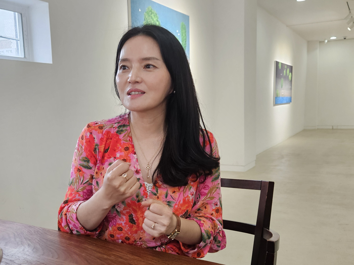 이영지 작가가 자신의 개인전이 열리고 있는 서울 인사동 선화랑에서 작품에 대해 설명하고 있다. 송경은 기자 “아버지가 돌아가시기 1년 전쯤 제가 인간관계 문제로 힘들어했을 때 해준 말씀이 있었어요. 너무 힘들어하지 말고,하늘 보고 크게 한 번 숨을 내쉬어보라고요. 그런데 아버지가 돌아가시고 나니 그 말씀이 떠올라 밤하늘을 보는 것 자체가 너무 힘들었죠.”