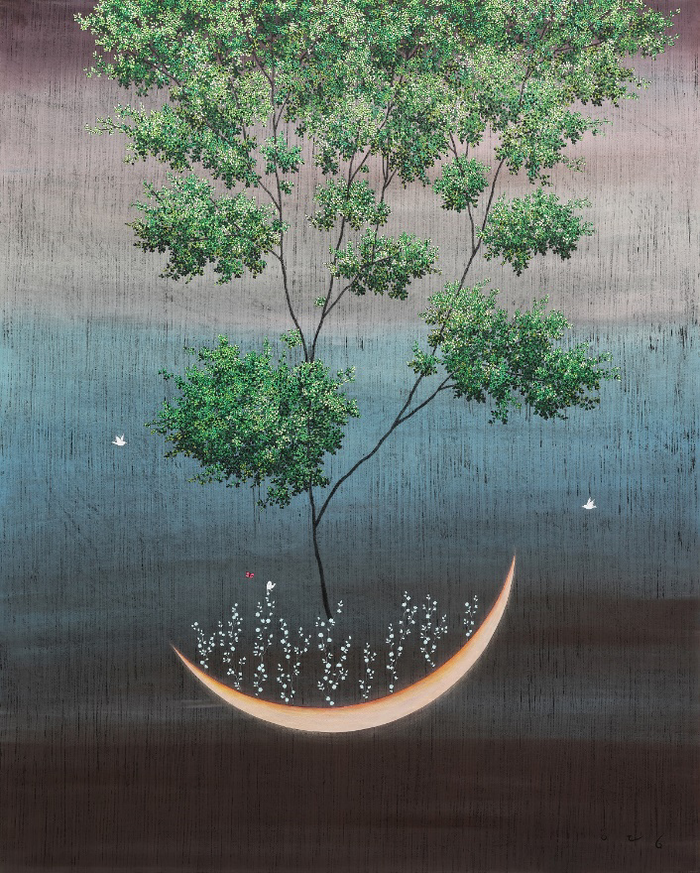 이영지 ‘포근한 어둠이 찬란해’(2025). 선화랑 작품들은 전체적으로 초승달이 뜬 밤을 배경으로 하고 있지만 일반적인 밤의 이미지처럼 어둡지는 않다. 화면은 밝은 하늘색 빛깔을 띨 때도 있고 벌건 대낮처럼 들판의 꽃들이 선명하게 모습을 드러내기도 한다. 이 작가는 “밤하늘에서 영감을 얻은 이미지지만 꼭 하늘이라고 생각하고 그리진 않았다”고 말했다. 실제로 ‘행복한 그 나날들’(2025)에서는 초승달이 화면 아래에 있고 그 위로 나무가 자라났다. 대지와 하늘의 경계도 알 수 없고 하늘과 땅이 전복된 것처럼 보이기도 한다.