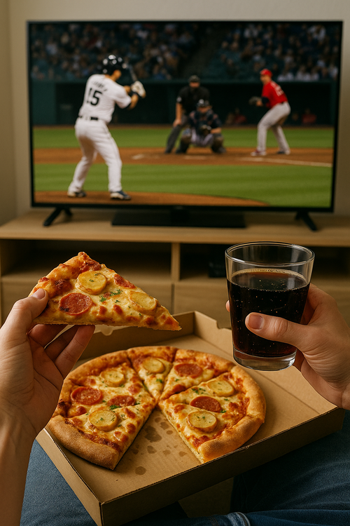 야구를 집에서 보며 피자도 먹는 사람을 주제로 생성형 AI가 제작한 이미지 [챗GPT] 신한은행은 다음달 9일까지 2025 신한 SOL Bank KBO 리그 ‘집관(집에서 관람) SNS 인증’ 이벤트를 진행한다고 28일 밝혔다.