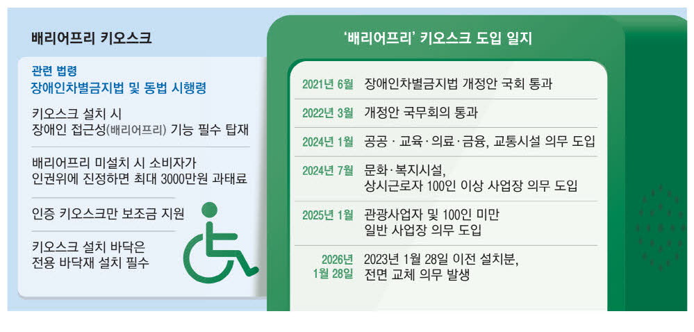 배리어프리 키오스크는 음성 안내,점자 키패드,높이 조절 등 장애인들이 사용하기 편리한 기능을 탑재한 키오스크다. 2024년부터 부분적으로 시행된 장애인차별금지법 시행령 개정안에 따라 내년 1월 28일부터 바닥 면적 50㎡ 이상 사업자가 키오스크를 들여놓을 때는 배리어프리 기능을 탑재한 기기를 반드시 설치해야 한다.