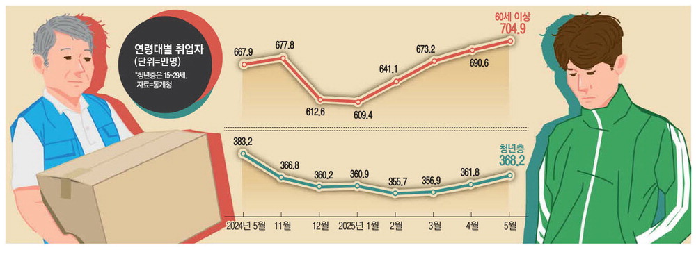 겉으로는 고용지표가 빠르게 개선되는 듯하지만,증가의 실체는 '고령층 중심의 양적 팽창'에 가깝다. 5월 60세 이상 취업자는 전년 동월보다 37만명 늘어 704만9000명을 기록하며 처음으로 700만명을 넘어섰다. 이는 전체 취업자 증가폭(24만5000명)을 웃도는 수치다. 반면 이 기간 청년층(15~29세) 취업자는 15만명 줄었고,고용률도 0.7%포인트 하락한 46.2%로 13개월 연속 내림세를 보였다.