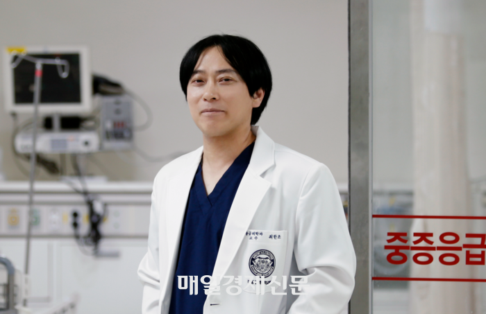 최한조 교수가 강동경희대병원 응급실에서 진료를 준비하고 있다. 강동경희대병원 “한겨울인데도 등이 땀으로 흠뻑 젖을 때가 있어요. 위중한 환자를 마주해야 하는 응급실 의사의 숙명이죠. 숨 가쁜 현장에서도 매일,데이터를 어떻게 활용할지 고민합니다.”