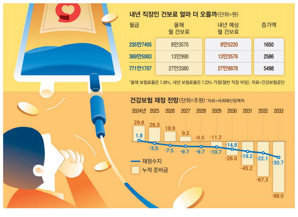 하지만 현재 건강보험 재정 전망을 감안하면 보험료율을 당분간 꾸준히 올려야 하는 처지다. 올해부터 계속 보험료율을 2%씩 인상하면 2032년 보험료율은 법적 상한인 8%를 넘어갈 것으로 보인다. 이후로 보험료율을 계속 올리려면 법을 개정해야 하는데 사회적 합의를 이끌어내기가 쉽지 않다.