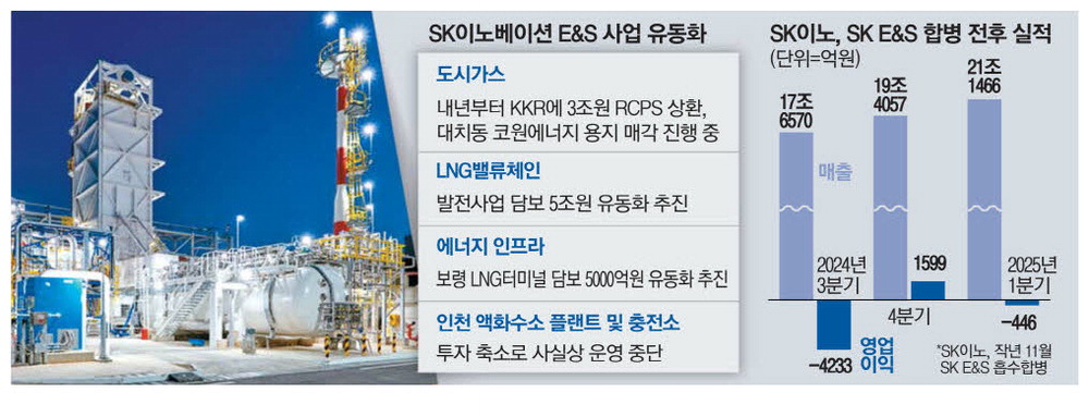 8일 재계에 따르면 매년 수천억 원 영업이익을 내며 그룹 배당의 주축을 맡아온 SK이노베이션 E&S의 도시가스,액화천연가스(LNG) 밸류체인 등 주요 사업이 모회사인 SK이노베이션의 리밸런싱(구조조정) 충격파에 흔들리는 양상이다. SK이노베이션은 지난해 7월 에너지 계열사 간 시너지와 사업 포트폴리오 다각화를 내세우며 SK E&S와의 합병을 공식 발표했다. 하지만 합병 발표 1년도 안돼 SK E&S부문의 핵심 사업인 LNG 발전소 밸류체인 전반이 유동화 대상으로 묶이며,최대 5조원 규모의 자금 조달이 추진되고 있다. 여기에는 연간 6000억원 이상의 영업이익을 내는 발전 자회사들이 포함됐다. 이에 더해 SK이노베이션 E&S는 최근 LNG 밸류체인의 중추이자 가교 역할을 하는 충남 보령 LNG 터미널 지분을 담보로 한 자산 유동화 작업도 추진 중이다.