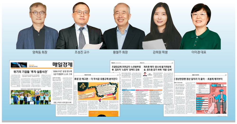 매일경제 독자위원회 정례회의가 지난달 26일 열렸다. 이날 회의에는 양희동 한국경영학회 회장(이화여대 경영학부 교수)이 새 독자위원으로 참석했다. 또 대학생 강희원 씨와 이미경 환경재단 대표,조성진 서울대 경제학과 교수,황철주 주성엔지니어링 회장 등 4명의 독자위원(가나다순)이 함께했다. 독자위원들은 5~6월 매일경제신문의 보도와 매경이코노미,매경럭스멘 기사에 대해 평가했다.
