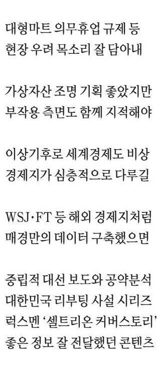 새 정부 출범에 맞춰 경제 분야를 비롯해 예상되는 정책 향방을 분석하는 기사가 돋보였다. 대형마트 의무휴업 제도와 같이 실효성을 다한 규제가 다시 강화할 수 있다는 우려 등 현장의 목소리를 충실히 담았다. 7년 이상 연체된 5000만원 이하 무담보 빚을 소각하는 '빚 탕감' 대책처럼 포퓰리즘 정책이 추진되는 상황이다. 국가 재정이 풍족하지 않은 상황에서 매경이 경계의 목소리를 좀 더 날카롭게 내야 한다.
