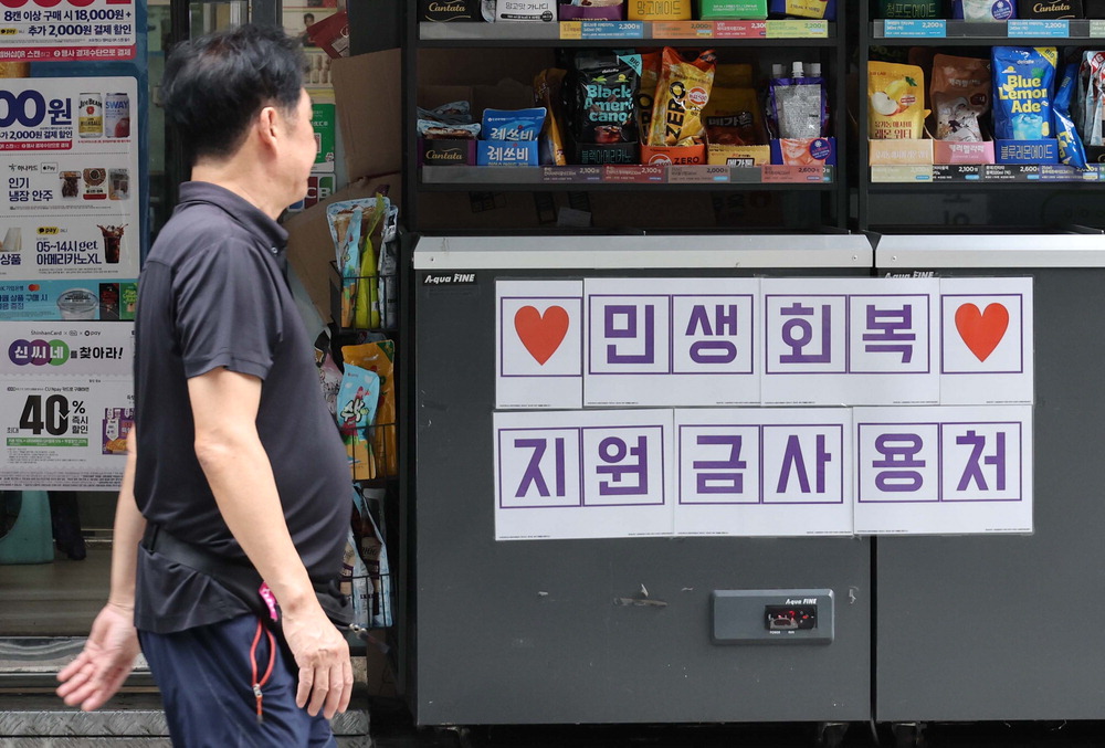 14일 서울 시내 한 편의점 앞에 '민생회복 지원금 사용처'라는 팻말이 붙어 있다. 민생회복 소비쿠폰은 국민 1인당 15만~55만원이 지급되며 1차 신청은 이달 21일 오전 9시부터 9월 12일 오후 6시까지 온·오프라인으로 할 수 있다. 신용·체크카드,선불카드,지역사랑상품권 중 원하는 방식을 선택해 받을 수 있다. 앞서 행정안전부는 금융위원회를 통해 카드사에 민생회복 소비쿠폰 사용 시 카드 수수료를 인하해줄 것을 요청했으나 카드사가 난색을 보여 수수료 인하는 이뤄지지 않았다. 한주형 기자