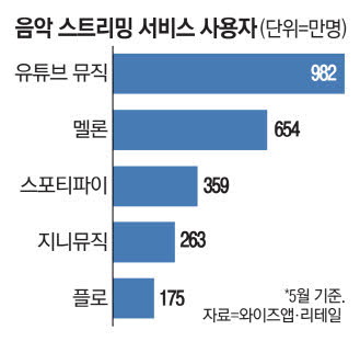 구글은 그간 국내에서 유튜브 동영상과 음악 서비스가 결합된 유튜브 프리미엄 상품만 판매했다. 영상 스트리밍 분야의 선두 서비스가 음악 스트리밍까지 함께 제공하면서 자연스럽게 시장을 독식했다. 와이즈앱·리테일에 따르면 지난 5월 기준 음악 스트리밍 앱 월간활성이용자는 유튜브 뮤직 982만명,멜론 654만명,스포티파이 359만명,지니뮤직 263만명,플로 175만명 순이다.