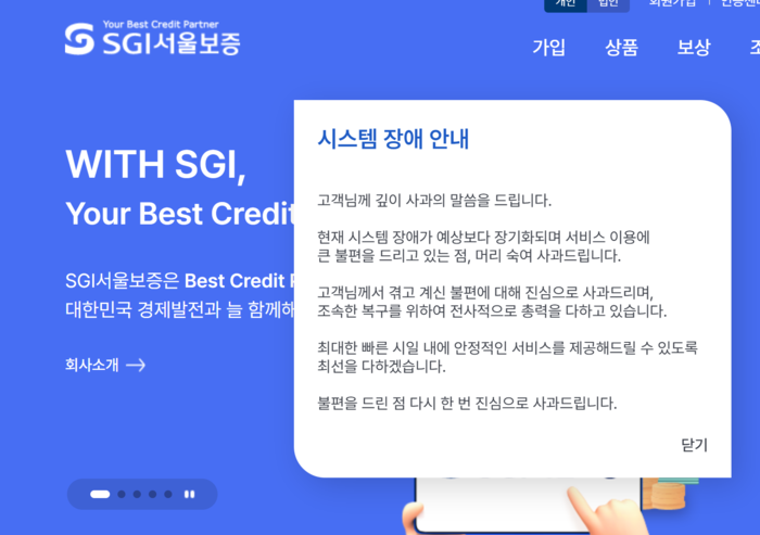 시스템 장애를 안내하는 SGI서울보증. 홈페이지 캡처 SGI서울보증이 지난 14일 랜섬웨어 공격으로 전산망이 마비된 데 따른 피해 구제를 위해 ‘피해신고센터’ 운영을 시작한다고 16일 밝혔다.