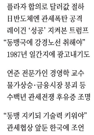 또한 도널드 트럼프 대통령의 미친 듯 보이는 관세 정책은 하늘에서 뚝 떨어졌거나 쉽게 폐기될 수 있는 성질의 것이 아니라는 분석에 주목할 필요가 있다. 트럼프 대통령의 관세 집착은 40년 전에 시작됐다. 1987년 미국의 무역적자 급증에 분노한 것은 미국 정부와 자동차 노조뿐만이 아니었다. 뉴욕 맨해튼에서 부동산 개발업을 하던 40세의 사업가 트럼프도 격노했다. 그는 자기 돈을 써서 유력 일간지 '뉴욕타임스'와 '워싱턴포스트' '보스턴글로브'에 자신의 견해를 광고로 실었다. 이 광고에서 트럼프 대통령은 최근에도 귀에 못이 박히게 들었던 것과 비슷한 논리를 펼쳤다.