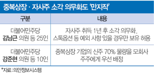 자사주 소각 의무화도 가시권에 들어섰다. 더불어민주당은 자사주의 원칙적 소각과 관련된 내용을 담은 상법 개정안을 발의했다. 자사주를 취득 1년 이내 소각하도록 하고 스톡옵션 등 특별한 사유만 예외로 인정하는 게 골자다. 예외 사유의 경우 정기 주주총회의 승인을 받아야 한다. 이에 일부 기업은 규제 강화를 피하는 ‘막차’를 타기 위해 서두르고 있다.