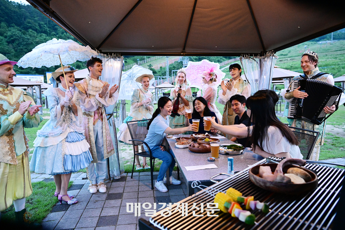 한여름 밤의 낭만페스타 23일 경기도 광주 곤지암리조트 잔디광장 내 셀프 BBQ가든을 찾은 투숙객들이 바베큐파티를 하고 있다. 곤지암리조트는 여름 휴가철을 맞아 7월 11일부터 10월 초까지 ‘한여름 밤의 매직 타임 공연’을 선보인다. 숲 속 요정들의 이야기로 꾸며진 이번 공연은 바이올린·아코디언 연주,저글링,거리 공연 등 다양한 콘텐츠로 리조트 전역에서 펼쳐진다. 2025.07.24 [이승환기자]