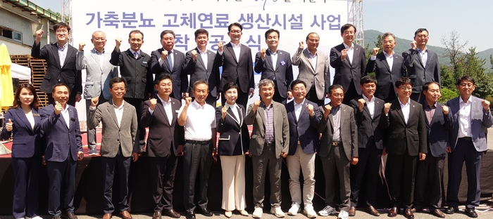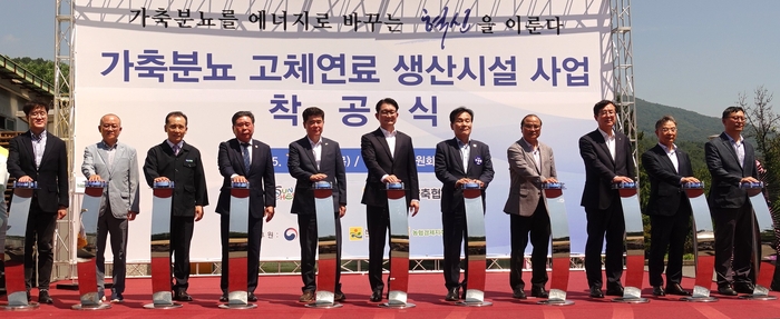 순천광양축협은 24일 순천시 별량면 경축순환자원화센터에서 ‘가축분뇨 고체연료화 생산시설’ 착공식을 가졌다. 사진 윗줄 왼쪽 세번째부터 이성기 순천광양축협 조합장,강형구 순천시의회 의장,정광현 순천시 부시장,김종구 농림축산식품부 식량정책실장,주철현 더불어민주당 의원,문홍길 축산환경관리원장,안병우 농협축산경제 대표. 가축분뇨를 고체 연료로 만들어 발전소에서 석탄 대신 사용할 수 있도록 하는 친환경 에너지 시설이 전남 순천시에 들어선다. 가축분뇨로 인한 고질적인 환경 오염 문제를 획기적으로 개선할 수 있는 시설이라는 점에서 주목된다.