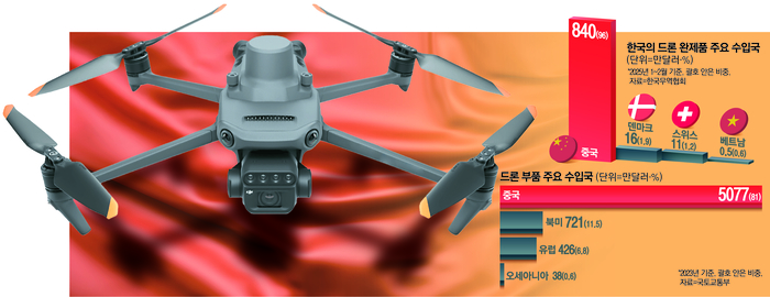10일 매일경제가 국내 드론 공급망을 분석한 결과 완제품부터 부품에 이르기까지 중국산 의존도가 절대적인 것으로 드러났다. 한국무역협회 및 업계에 따르면 올해 1~2월 기준으로 원격조종 비행만 가능한 드론(최대 이륙 중량 250g 초과 7㎏ 이하)의 경우 중국산 규모가 839만6000달러에 달했다. 전체의 96%를 차지한 것이다. 반면 대중(對中) 드론 수출은 40만5000달러로,드론 수출의 5.5%에 그쳤다.