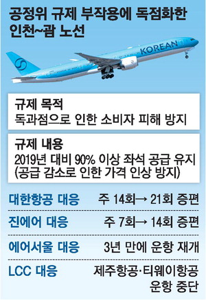 대한항공은 이 규제를 준수하기 위해 ‘울며 겨자 먹기’ 식으로 현재 비인기 노선인 인천~괌 노선을 주 14회에서 21회로 확대했고 진에어는 7회에서 14회로 늘렸다. 에어서울은 지난달부터 3년만에 해당 노선을 재운항하기로 했다.