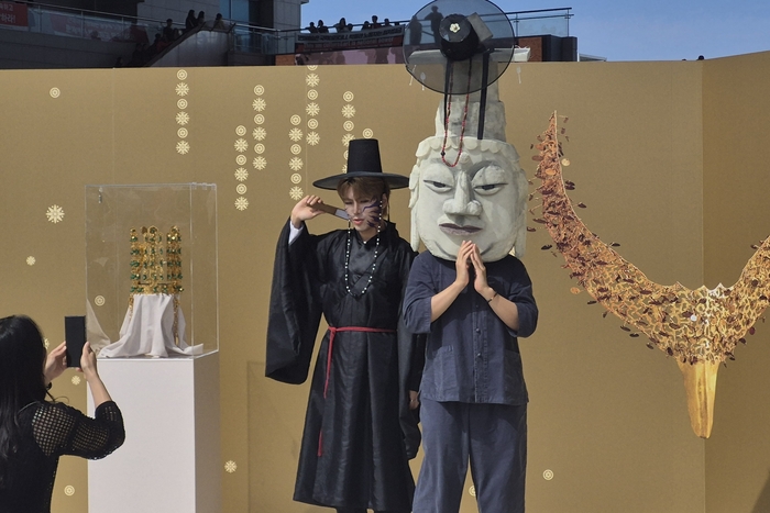 9월 27일 서울 용산구 국립중앙박물관에서 열린 ‘2025 국중박 분장놀이’ 포토존에 사자보이즈(왼쪽)와 관람객이 포즈를 취하고 있다. <국립중앙박물관> 앞서 지난 9월 열린 분장대회에서는 참가자들이 경주 황오동 금귀걸이,금동관음보살좌상,고려청자 등 문화유산으로 분장하며 큰 호응을 얻었다. 참가자들은 유물의 특징과 역사적 배경을 조사하며 대회에 참여했다. 박물관이 단순히 관람의 공간을 넘어 참여형 공간으로 변모한 셈이다.