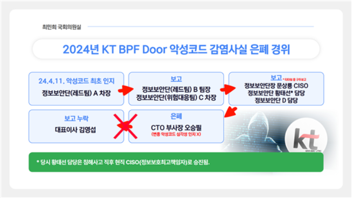 KT는 “문상룡 단장과 모현철 담당이 당시 정보보안 부문장인 오승필 부사장과 티타임 중 구두로 ‘악성코드가 발견됐다’는 상황을 간략히 전달했다”라며 “다만 오 부사장은 일상적인 보안 상황 공유로 인식했을 뿐 심각성을 인지하지 못했다”고 설명했다.