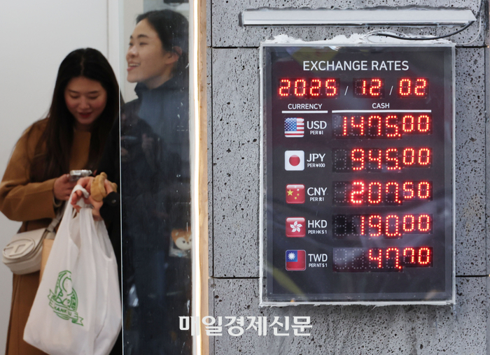 2일 서울 중구 명동의 한 환전소 앞 전광판에 환율이 표시되고 있다. 이날 한국은행에 따르면 전날(1일)까지 2025년 연평균 환율은 1419.16원으로,지난 1998년 국제통화기금(IMF) 외환위기(약 1395원) 당시나 2009년 글로벌 금융위기(약 1276.4원) 때보다도 높은 수준이다. 2025.12.2 [이승환기자] 이처럼 ‘역행’이 계속되는 원인은 단순히 국제유가만으로는 설명할 수 없다. 주된 요인은 ▲ 달러 대비 원화 약세,즉 ‘고환율’ ▲ 정부의 ‘유류세 인하율 축소’ ▲ 그리고 국내 정유·유통 구조에 내재한 시차 및 비용 구조다.