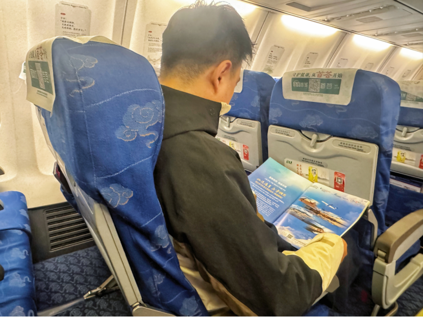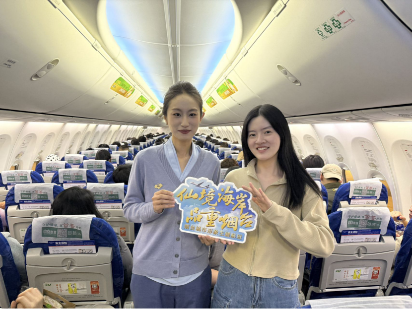 승무원이 테마 항공편에서 승객들에게 옌타이의 도시 매력을 소개하고 있다.