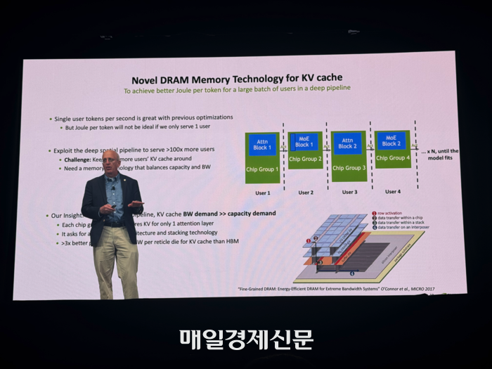 빌 달리 엔비디아 최고과학자 겸 리서치 부문 부사장이 18일(현지시간) 미국 새너제이에서 열린 ‘GTC 2026’ 세션에서 엔비디아 리서치 팀이 연구 중인 내용을 소개하고 있다. [사진 = 정호준 기자] “그래픽처리장치(GPU) 처리량(스루풋) 문제는 곧 데이터 이동 과정을 효율화하는 것과 직결됩니다. 컴퓨팅 에너지의 73%는 데이터 이동에 쓰이고 있습니다.”